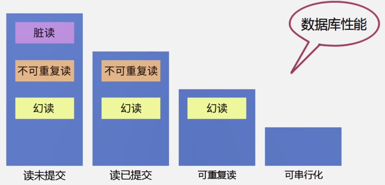 为了解决这些问题,MySQL数据库为事务设立了四个隔离级别,分别是读未提交、读已提交、可重复读、可串行化。这四个隔离级别在隔离度上以及对性能影响上有哪些不同,这样我们就可以更好地使用事务,做到理想的配置了。