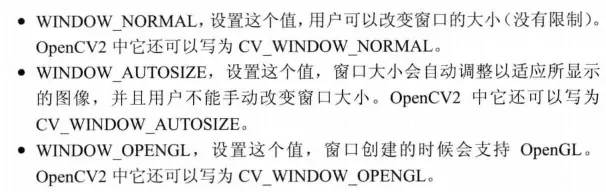 用于创建一个窗口,其函数原型为 void namedWindows(const string & winname ,int flags=WINDOW_AUTOSIZE);