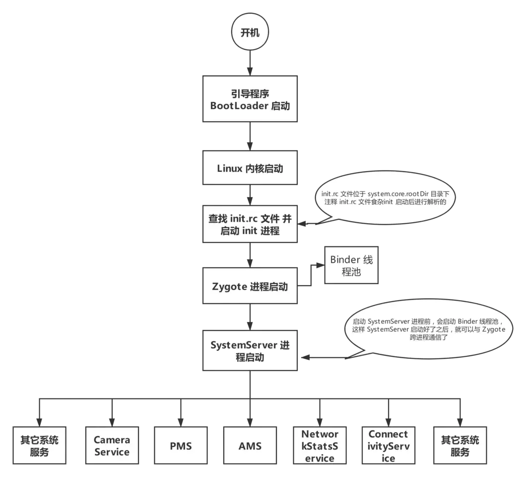 - 7.最后启动 AMS 进程是在 Zygote 中执行的,可以参考应用进程中的流程图。