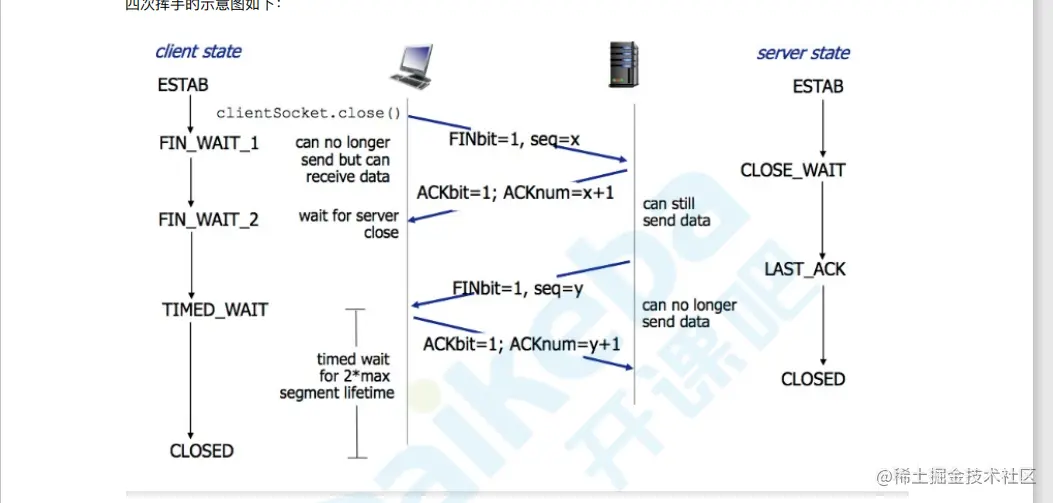 第三次挥⼿(FIN=1,seq=y)服务器端准备好关闭连接时,向客户端发送结束连接请求,FIN 置为1。发送完毕后,服务器端进⼊ LAST_ACK 状态,等待来⾃客户端的最后⼀个ACK