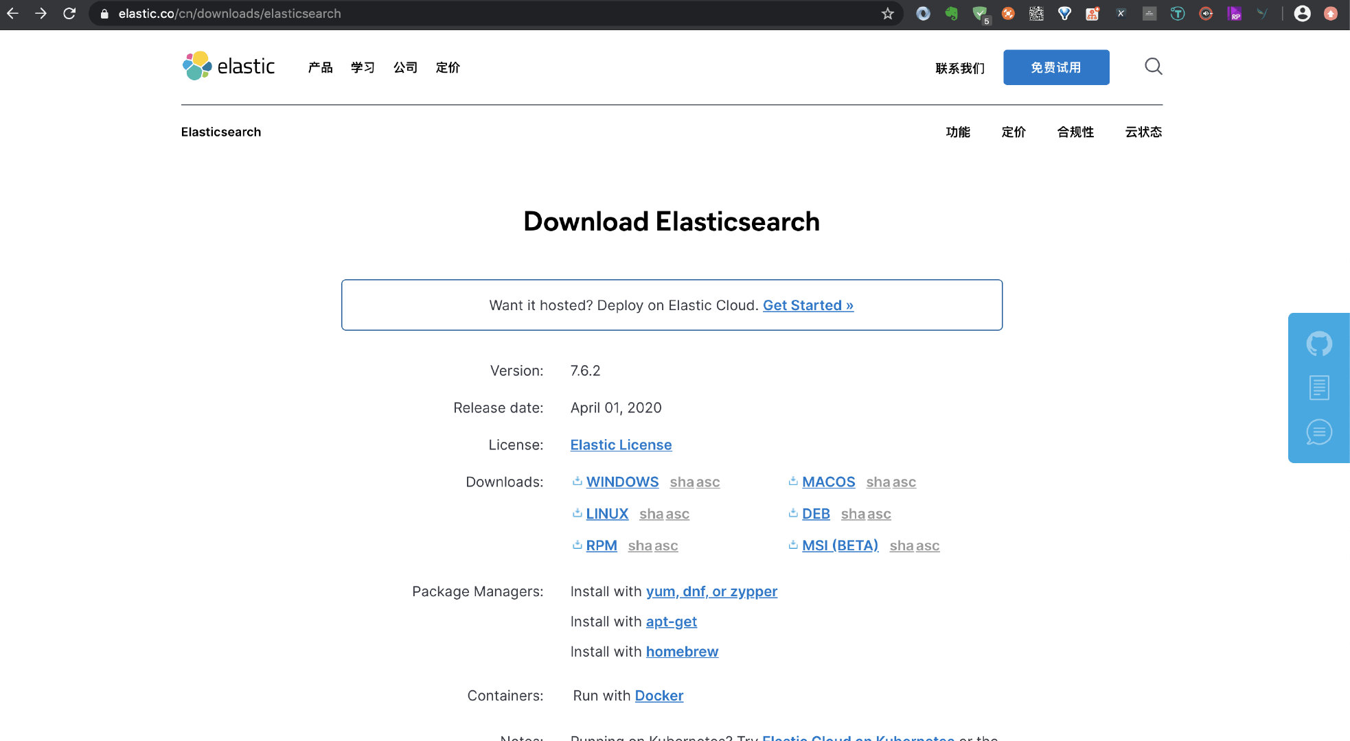 最新版本下载地址:https://www.elastic.co/cn/downloads/elasticsearch,如下图: