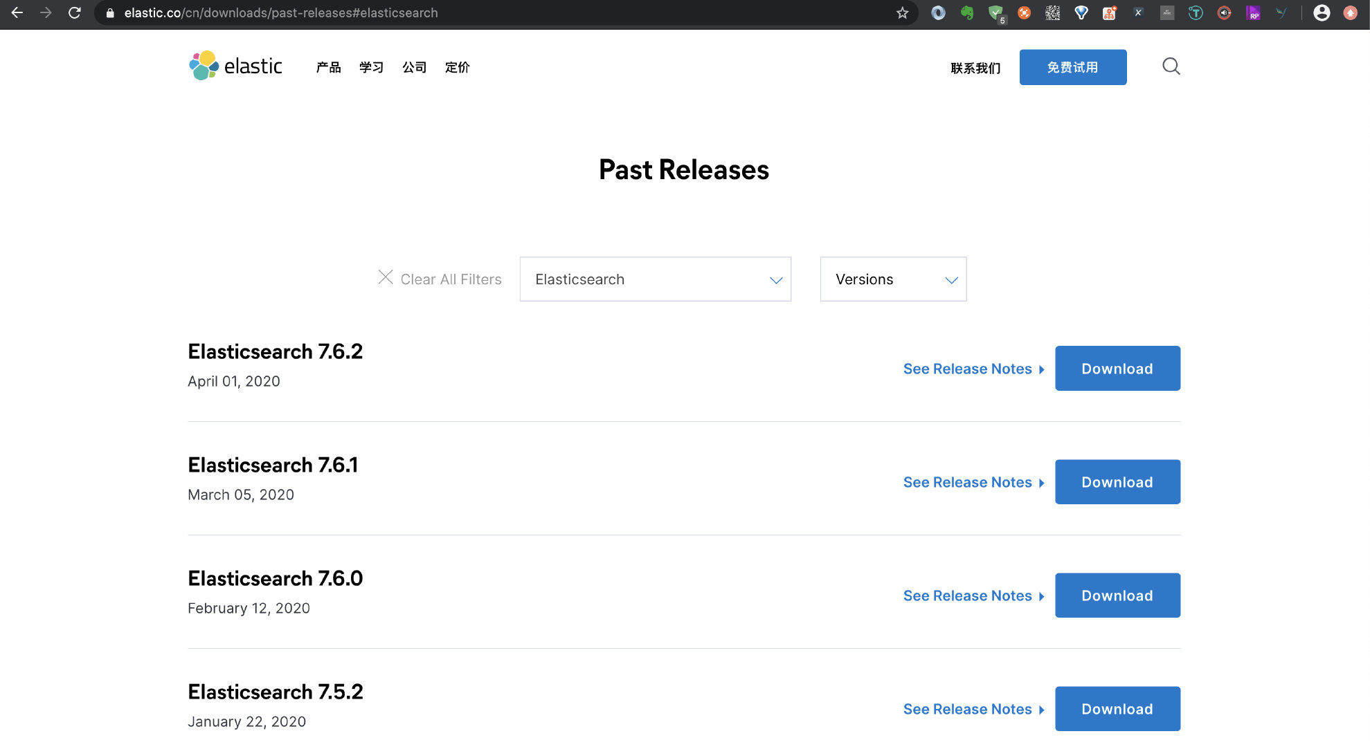 如果想使用其他版本,请使用这个地址进行下载:https://www.elastic.co/cn/downloads/past-releases#elasticsearch,如下图: