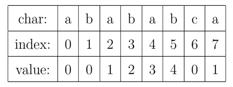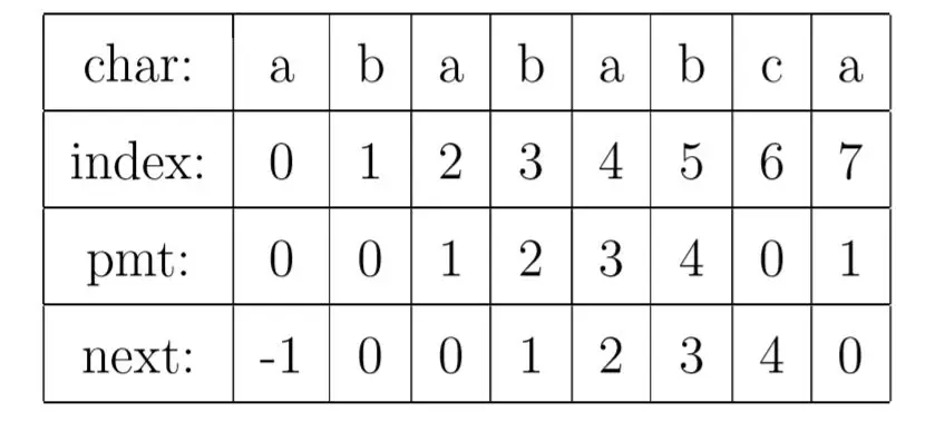 为了编程的方便,我们不直接使用PMT数组,而是将PMT数组向后偏移一位。我们把新得到的这个数组称为next数组。下面给出根据next数组进行字符串匹配加速的字符串匹配程序。其中要注意的一个技巧是,在把PMT进行向右偏移时,第0位的值,我们将其设成了-1,这只是为了编程的方便,并没有其他的意义,next数组如下表所示。