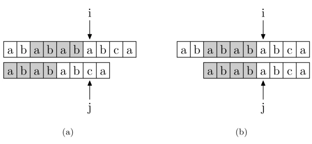 如上图所示,要在主字符串"ababababca"中查找模式字符串"abababca"。如果在j 处字符不匹配,那么主字符串从 i−j 到 i 这一段是与模式字符串的 0 到 j 这一段是完全相同的。