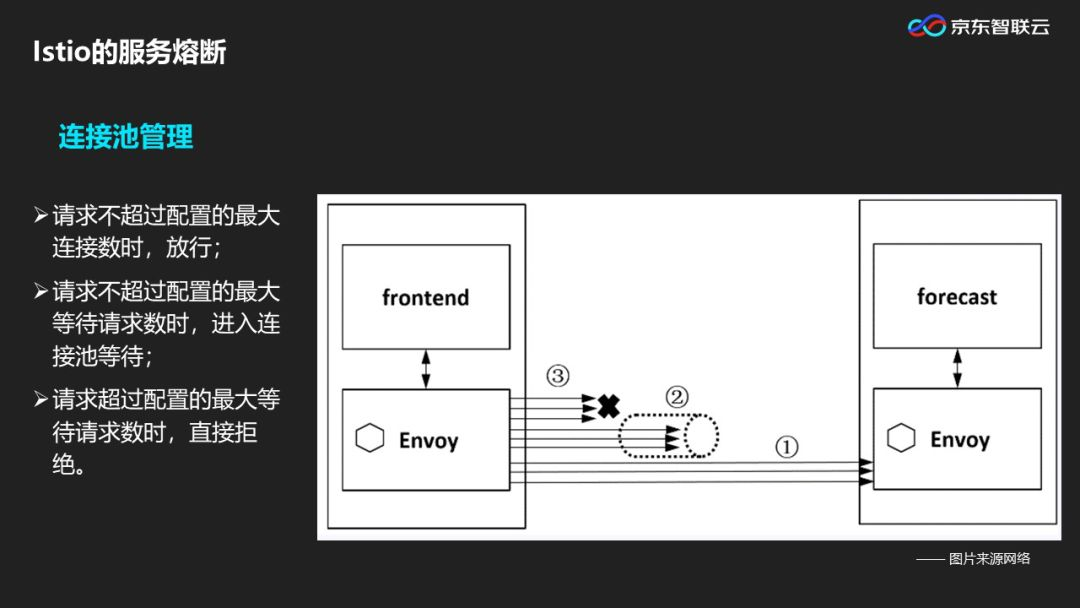 京东智联云研发了一套Istio的网关,来支持网关的互通。当一个请求过来时,通过网关放到已知的网格内。在把这个请求通过Envoy进行服务的发现和调用的过程,如果在网格内的话,通过纯网格的调用下发到Envoy。如果是网格内找不到这个服务就会打到Istio网关,Istio直接调用网格外的服务来适配,这是网格内外的互通。