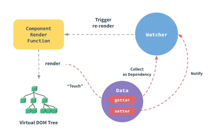 每个组件实例都对应一个watcher实例,他会在组件渲染过程中把接触的数据property记录为依赖。之后当依赖项的setter触发时,会通知watcher,从而使它关联的组件重新渲染。