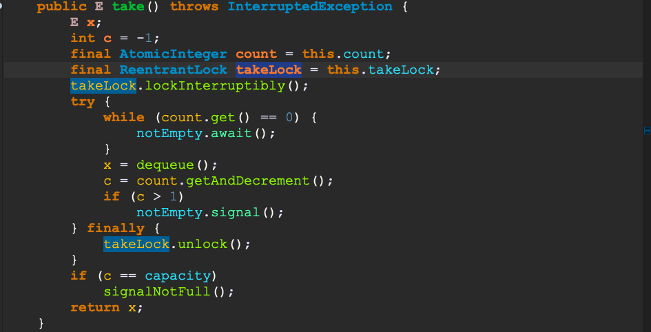 通过takeLock 和 putLock 两把锁 ,实现LinkedBlcokingQueue 取数据和写数据的分离。