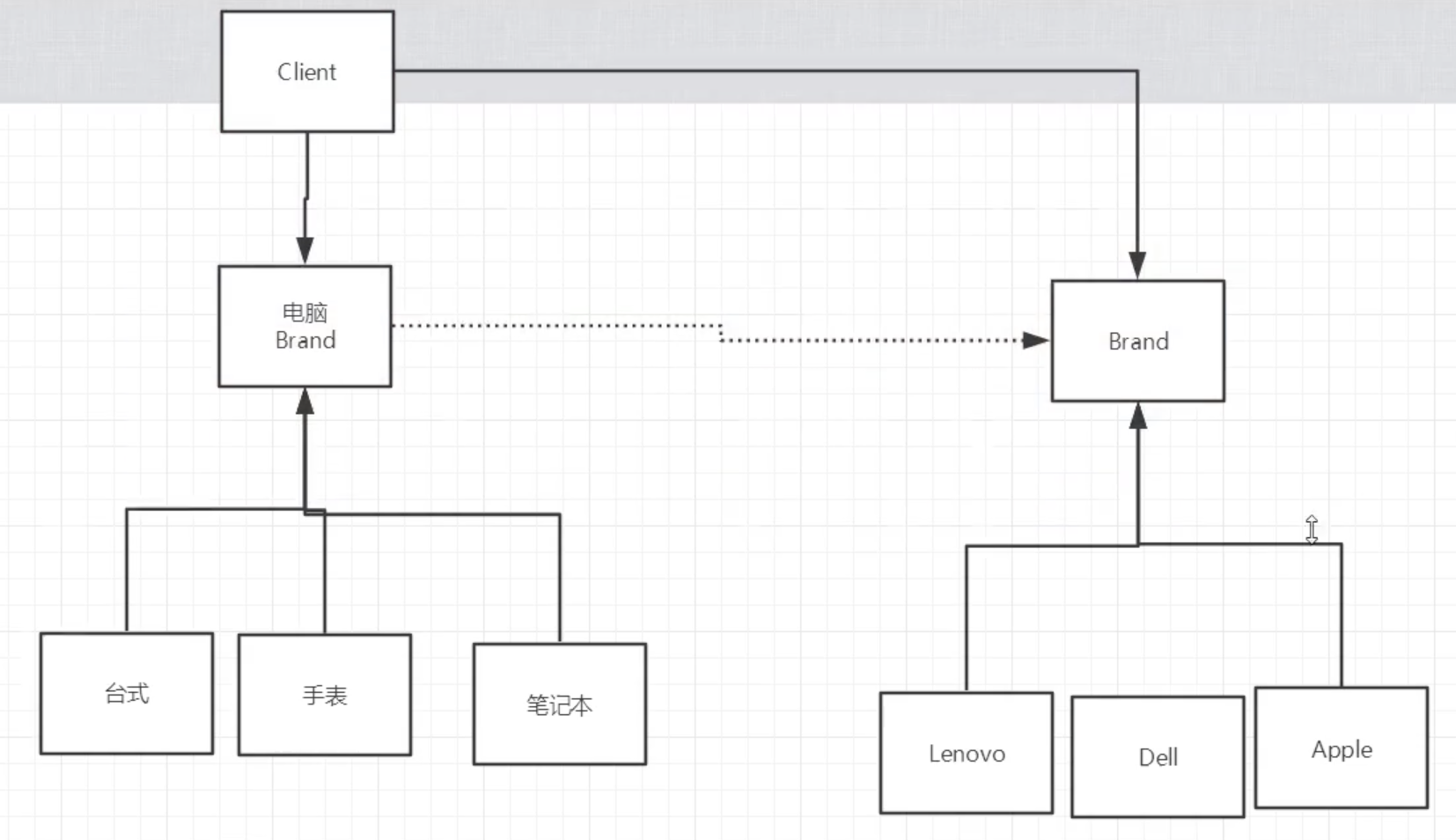 二.分析:上面的多继承,每次新增一个类型要加三个类,而且违背了单一指责原则,所以可以拆分成两个变化纬度:品牌,类型。