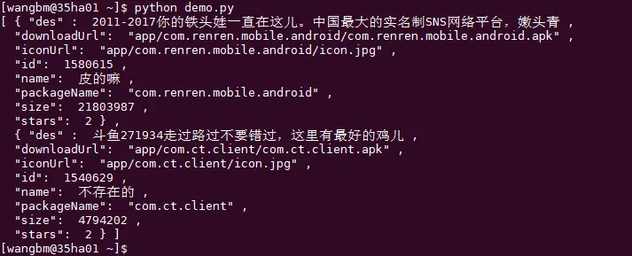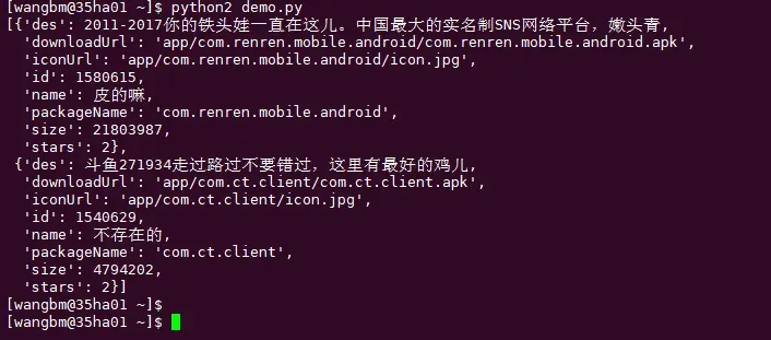 >>> info = [{"id":1580615,"name":"皮的嘛","packageName":"com.renren.mobile.android","iconUrl":"app/com.renren.mobile.android/icon.jpg","stars":2,"size":21803987,"downloadUrl":"app/com.renren.mobile.android/com.renren.mobile.android.apk","des":"2011-2017你的铁头娃一直在这儿。中国最大的实名制SNS网络平台,嫩头青"},{"id":1540629,"name":"不存在的","packageName":"com.ct.client","iconUrl":"app/com.ct.client/icon.jpg","stars":2,"size":4794202,"downloadUrl":"app/com.ct.client/com.ct.client.apk","des":"斗鱼271934走过路过不要错过,这里有最好的鸡儿"}]