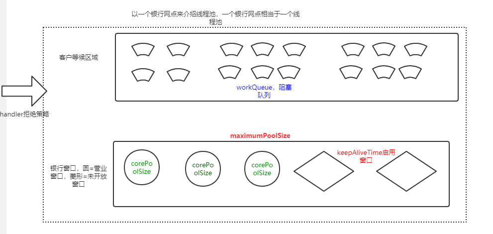 1:corePoolSize表示当前银行在运行的窗口,如果储户少,来了可以直接进行业务处理。