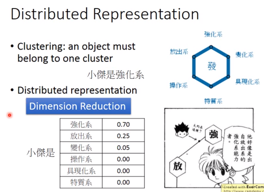 有些object跨了很多类,我们希望能够囊括它所有的类。可以用一个vector来概括一个object,这个vector能够概括它的特征,就叫做Distributed Representation,也叫作dimension reduction。