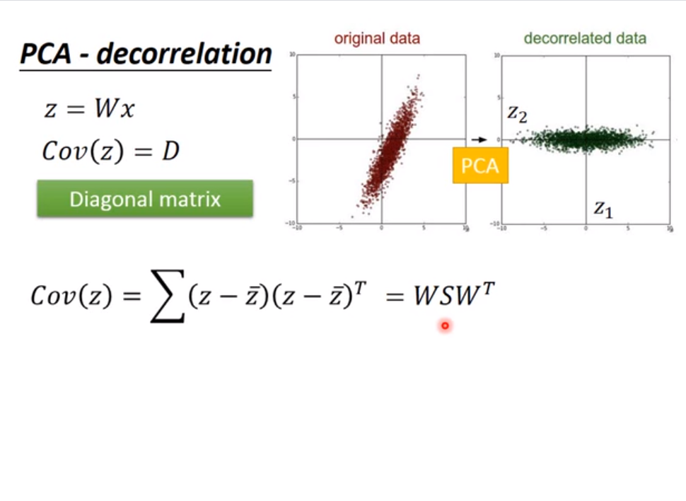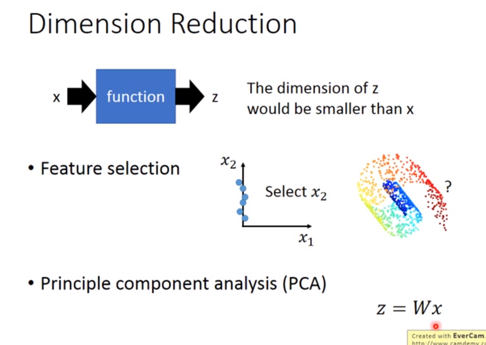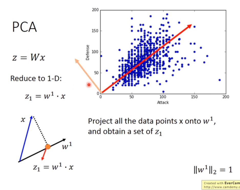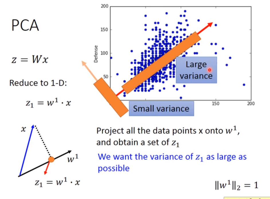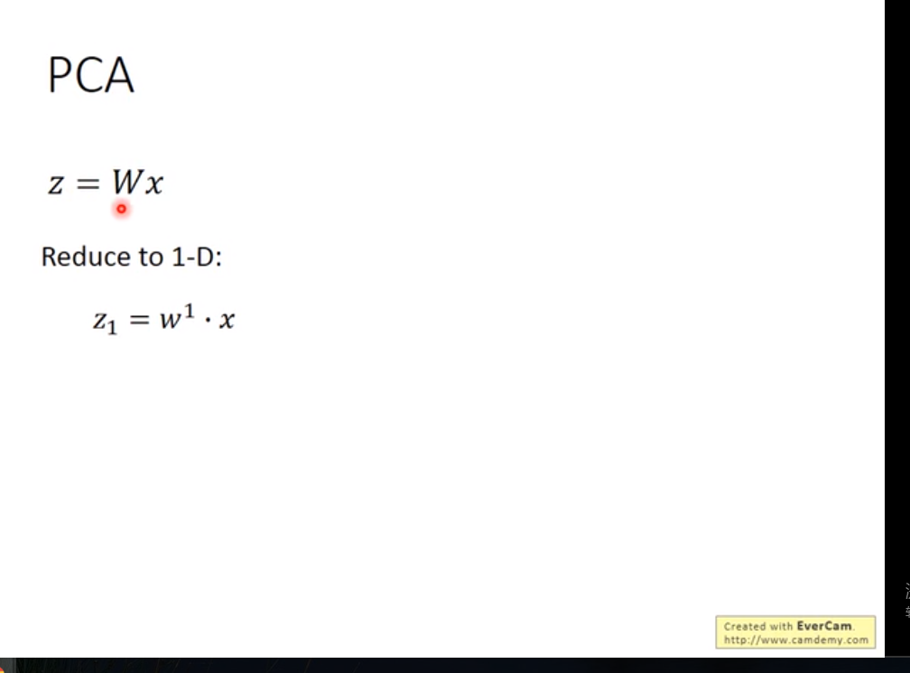 找一个W,使得它完成x到z的映射,z的维度比x低。假设考虑1维的case: