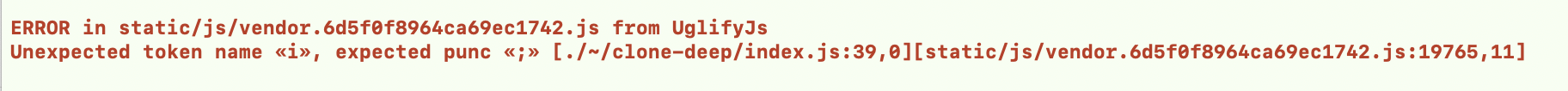 记一次vue项目build的坑(亲测有效,但是不太推荐) 暗夜本耶 2020-05-09 301 阅读1分钟 vue项目,在打包的时候,报以下这个错误 这个问题主要原因是由于Uglifyjs压缩引起的,因为uglifyjs压缩不支持es6的语法,所以我就直接去clone-deep这个包下面找到了index.js这个文件,找到当前行,把let改成了var,就可以正确的解决了,现在打包已经不报错了,不过这种方法是一种叫猴子补丁的方法,不太推荐
