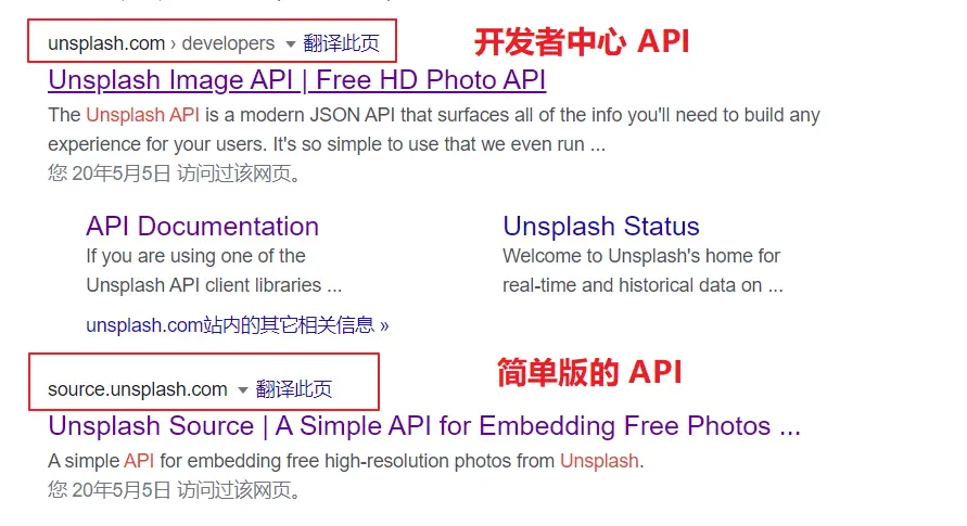unsplash 提供了 2 个版本的 API。 一个是简单版,主要是给小型应用,流量比较少的 app 使用,可以通过 source.unsplash.com 进入;一个是进阶版的开发者中心 API, 支持更多流量的 app 使用,可以通过 unsplash.com/developers 进入。