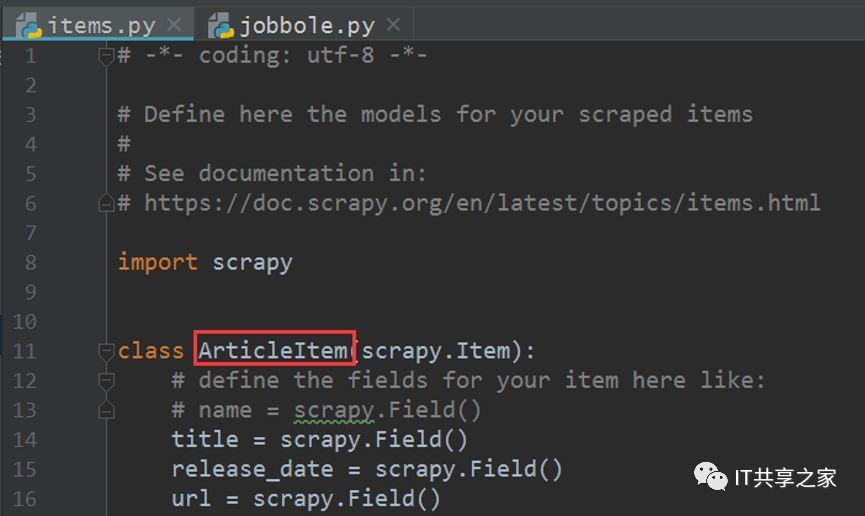 2、第一步的意思是说将items.py中的ArticleItem类导入到爬虫主体文件中去,将两个文件串联起来,其中items.py的部分内容如下图所示。