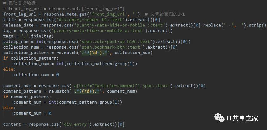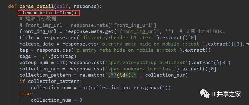 3、将这个ArticleItem类导入之后,接下来我们就可以对这个类进行初始化,并对其进行相应值的填充。首先去parse_detail函数下对其进行实例化,实例化的方法也十分简单,如下图所示。