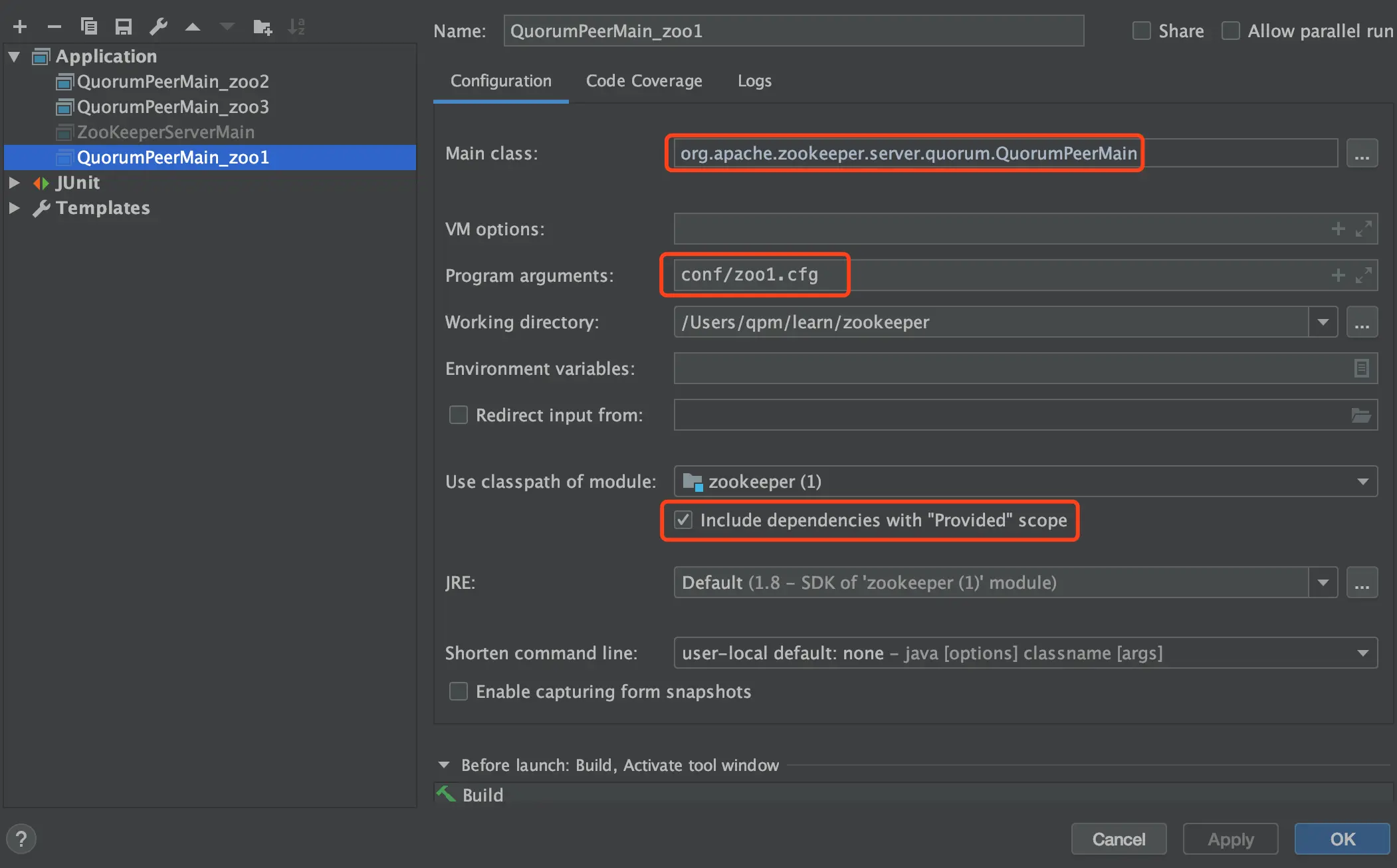 Run/Debug Configurations,定义 QuorumPeerMain 是执行main方法的类,并把配置文件文件的路径作为参数写入去。