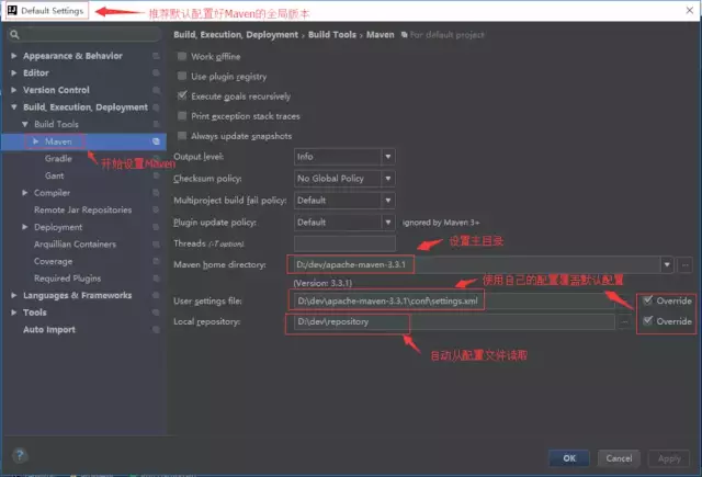 示例: 理论上只要配置了Maven主目录即可,实际开发推荐采用User Settins file .关注Java技术栈微信公众号在后台回复关键字:Maven,可获取Maven系列使用教程。