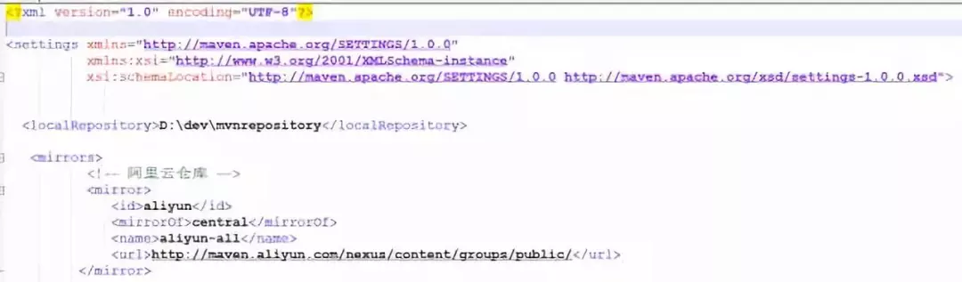这里提醒一下,Apache Maven 本地仓库的地址是自动生成的,通常在C盘的用户目录里,所以在实际开发中推荐大家指定本地仓库的地址,避免因重装系统或被第三方安全工具清理而丢失数据。Maven的配置很简单,删掉注释后一目了然。如图:
