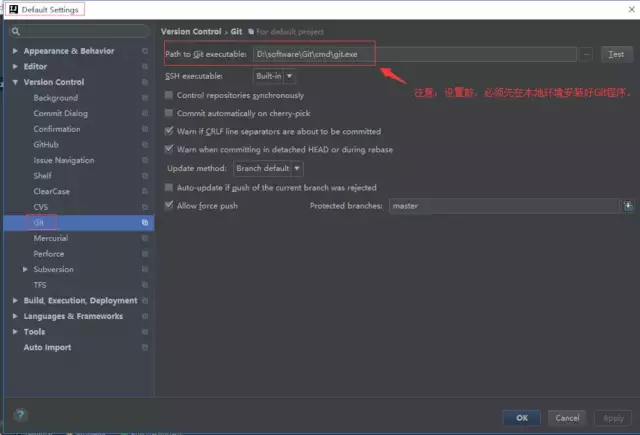 使用说明: IDEA默认集成了对Git/Svn的支持 直接设置执行程序,右边Test提示成功即可。推荐阅读:超详细的 Git 实战教程,傻瓜一看也会!