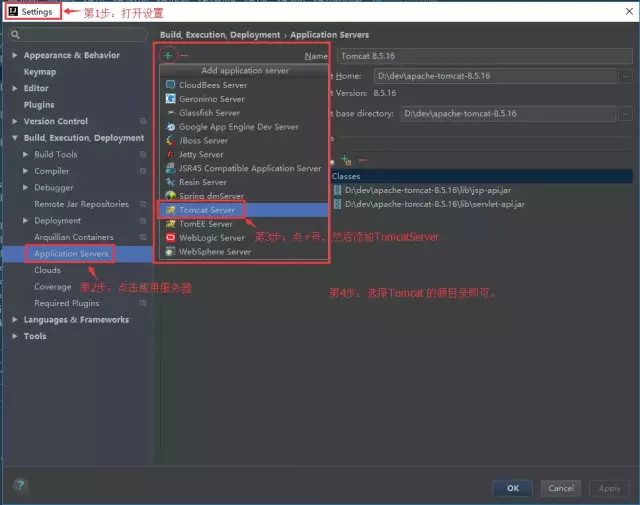 配置Tomcat方法: File -> Settings -> Deployment -> Application Servers -> Tomcat Server
