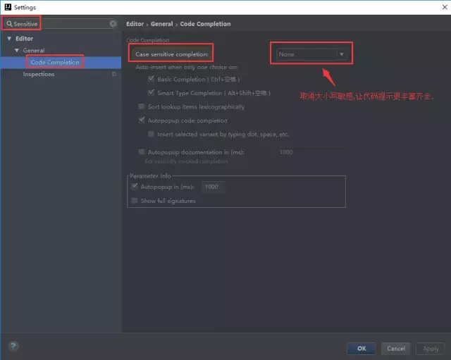 File | Settings | Editor | General | Code Completion Case | Sensitive Completion = None。