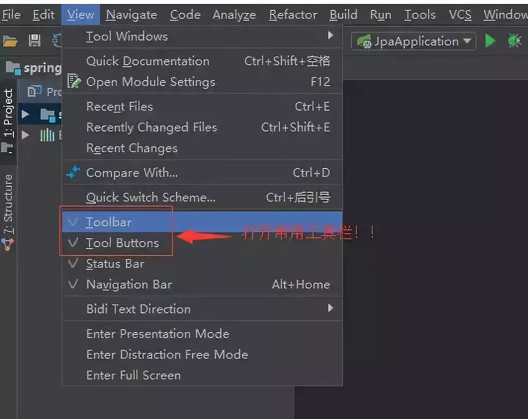 具体步骤:顶部导航栏 - View -> 勾选 Toolbar & Tool Buttons