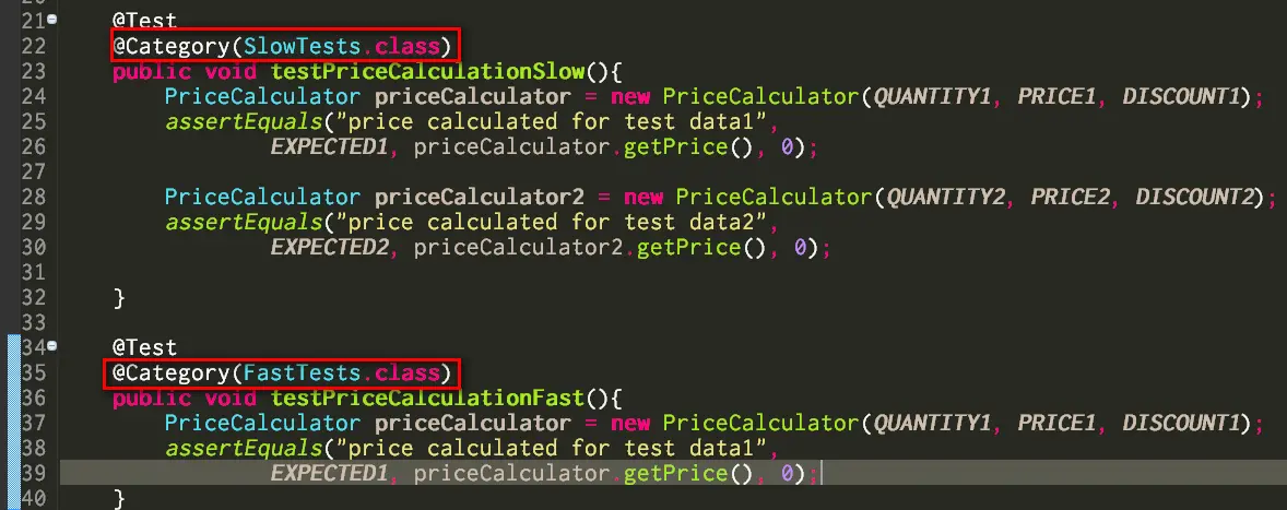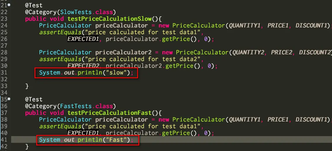 (1) Create empty class FastTests and SlowTests. (2) In your test case class, categorize your test method using @Category annotation: