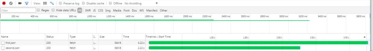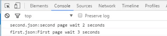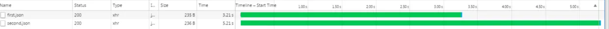 The two requests are handled simultaneously ( request B only takes 2 seconds to finish, no 3 seconds’ wait time for A to finish this time ), the response of second request returns first before the first, which could be observed in console:
