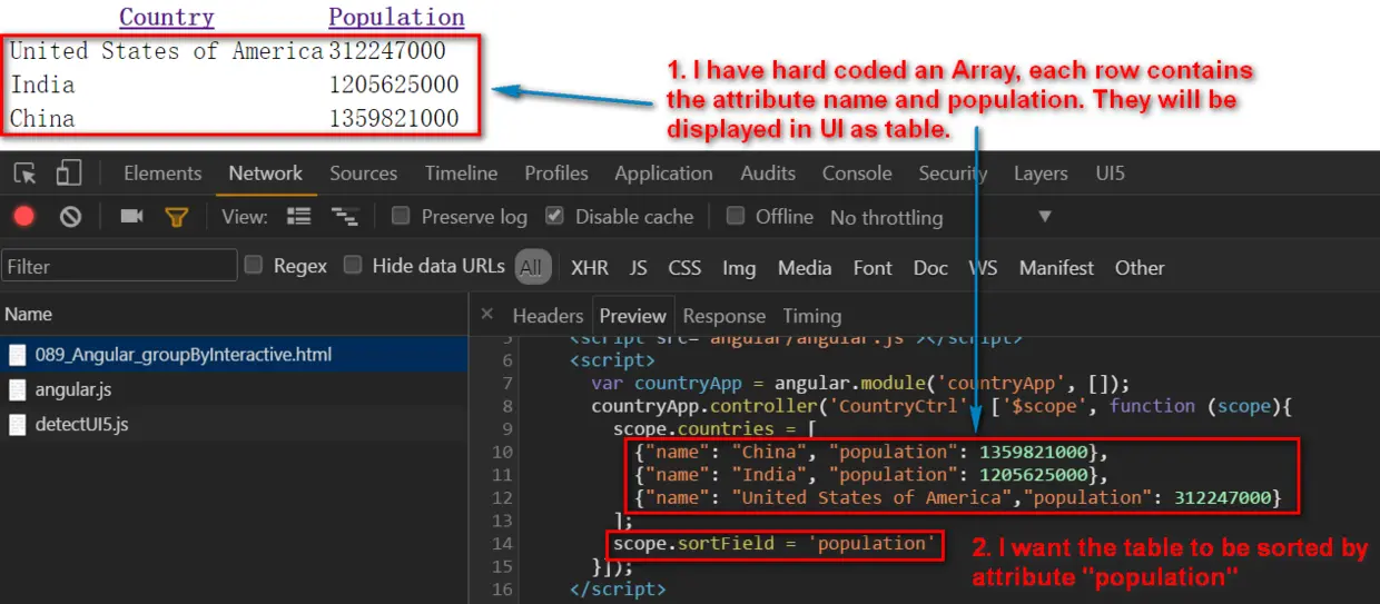 Finally, scope obj ( you can consider scope as “Model” in UI5 at this moment ) has attribute sortField which has been assigned with a new value “name”, this is how “sortField = ‘name’” is executed.