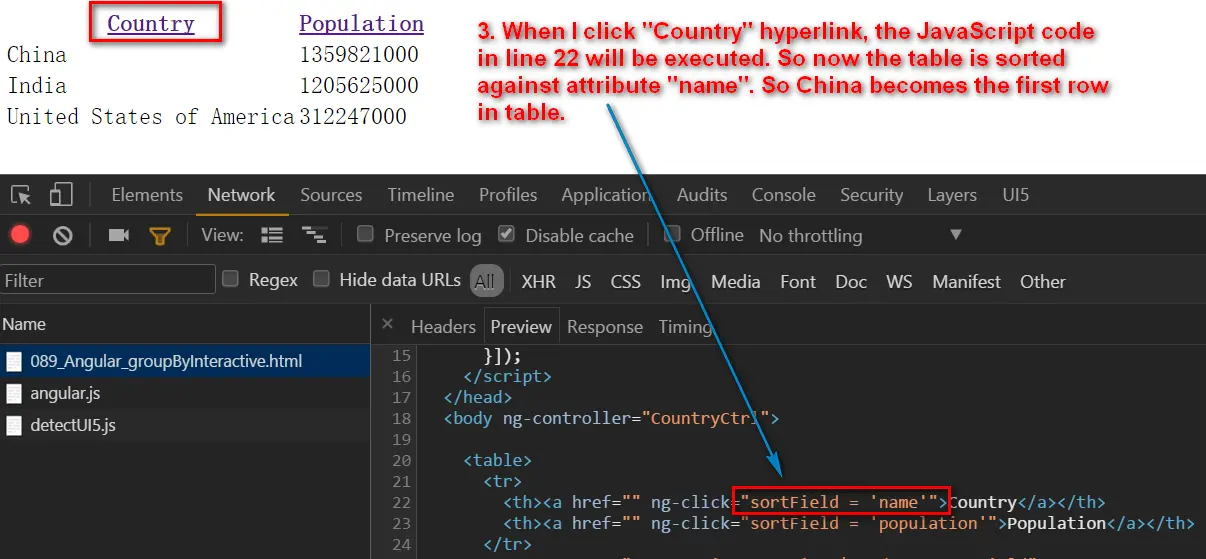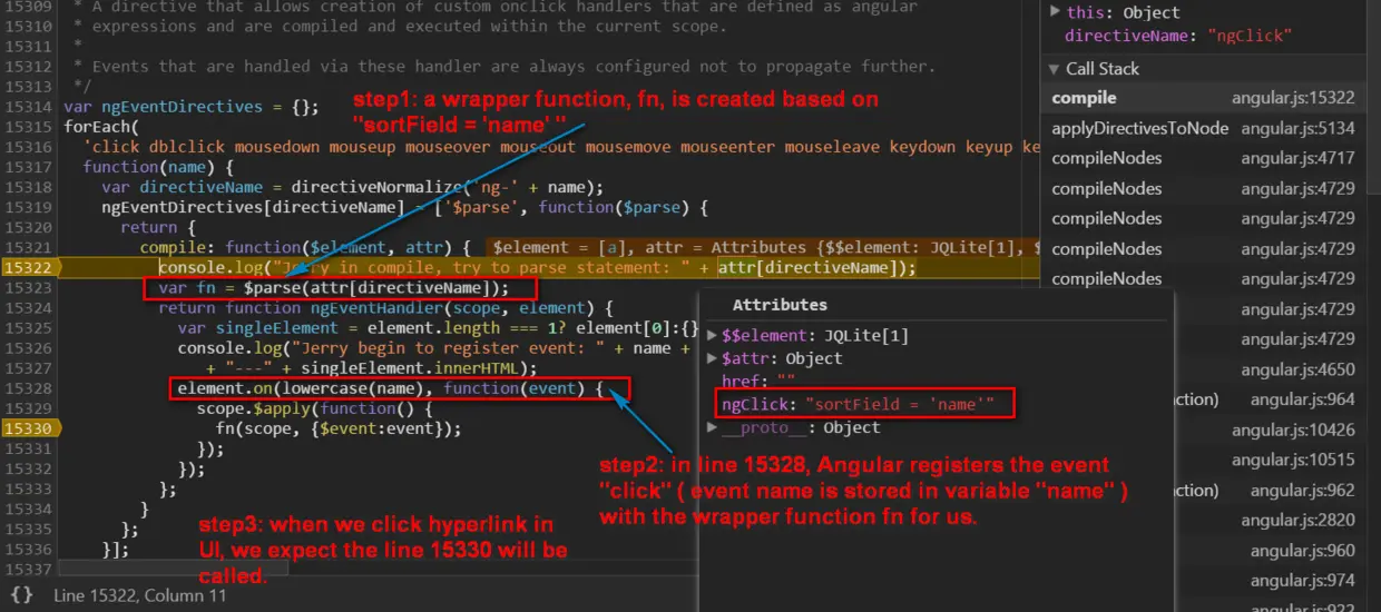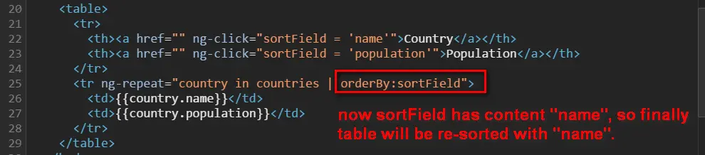 When I first study this application, the attribute “ng-click=”sortField = ‘name'”” seems to me a complete magic: how could a fragment of code in html node attribute executed?
