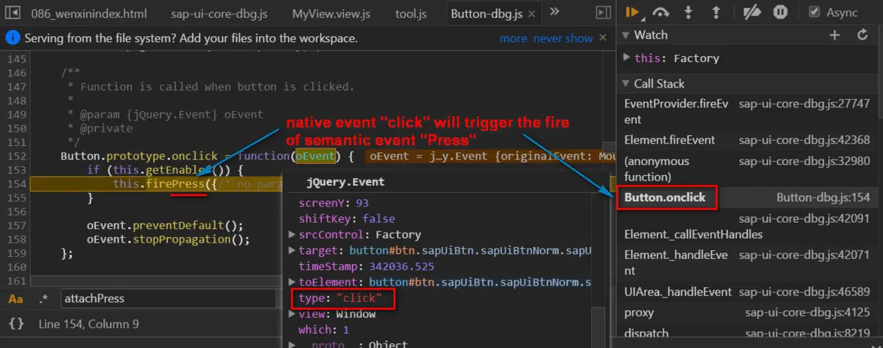 Let’s quickly review what UI5 developers should do if they need to listen to an event. Still use button as example: Just call function attachPress and pass in our event handling function as argument:
