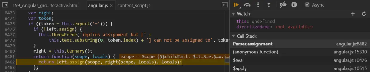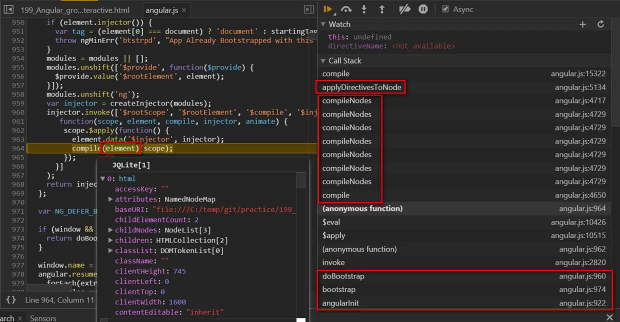 Angular framework has its own initialization and bootstrap phase, just the same idea as UI5. During its bootstrap, Angular will traverse the html DOM tree ( line 964, compile function ) and parse the html element node recursively. If an attribute with Angular namespace “ng” is detected within an element node, the detected attribute is called “directive” in Angular and some special logic will be applied on that node, in function “applyDirectivesToNode”.