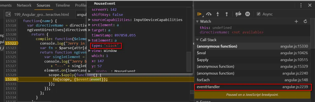 I am sure it is “ng-click” which achieves Angular’s specific way of event handling, so I tried to figure it out by debugging.