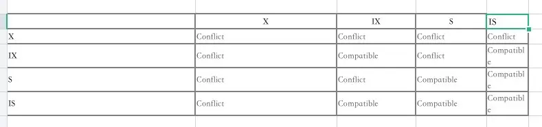 下表汇总了表级锁类型兼容性,即表锁和表级意向锁的兼容性。