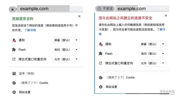 有了上面三个关键指标的保证,用户就可以和服务器进行安全的交换信息了。那么,既然你说了 HTTPS 的种种好处,那么我怎么知道网站是用 HTTPS 的还是 HTTP 的呢?给你两幅图应该就可以解释了。