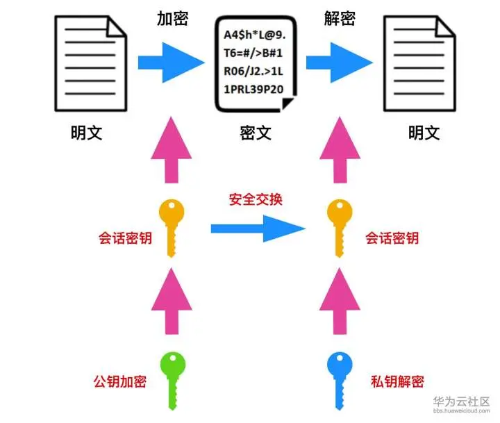 混合加密RSA 的运算速度非常慢,而 AES 的加密速度比较快,而 TLS 正是使用了这种混合加密方式。在通信刚开始的时候使用非对称算法,比如 RSA、ECDHE ,首先解决密钥交换的问题。然后用随机数产生对称算法使用的会话密钥(session key),再用公钥加密。对方拿到密文后用私钥解密,取出会话密钥。这样,双方就实现了对称密钥的安全交换。
