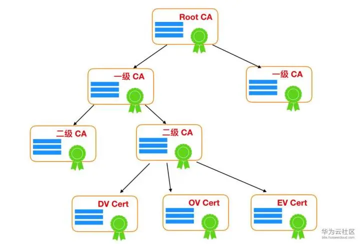 全世界具有认证的 CA 就几家,分别颁布了 DV、OV、EV 三种,区别在于可信程度。DV 是最低的,只是域名级别的可信,EV 是最高的,经过了法律和审计的严格核查,可以证明网站拥有者的身份(在浏览器地址栏会显示出公司的名字,例如 Apple、GitHub 的网站)。不同的信任等级的机构一起形成了层级关系。