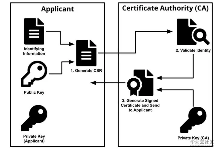通常情况下,数字证书的申请人将生成由私钥和公钥以及证书签名请求(CSR)组成的密钥对。CSR是一个编码的文本文件,其中包含公钥和其他将包含在证书中的信息(例如域名,组织,电子邮件地址等)。密钥对和 CSR生成通常在将要安装证书的服务器上完成,并且 CSR 中包含的信息类型取决于证书的验证级别。与公钥不同,申请人的私钥是安全的,永远不要向 CA(或其他任何人)展示。
