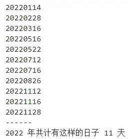 print("------\n%d 年共计有这样的日子 %d 天"%(year, len(udate)))