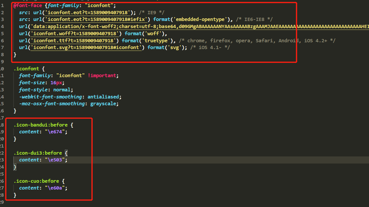 3. 打开下载文件中的iconfont.css文件, 将下列代码复制到在src/assets/icons/iconfont.css文件中