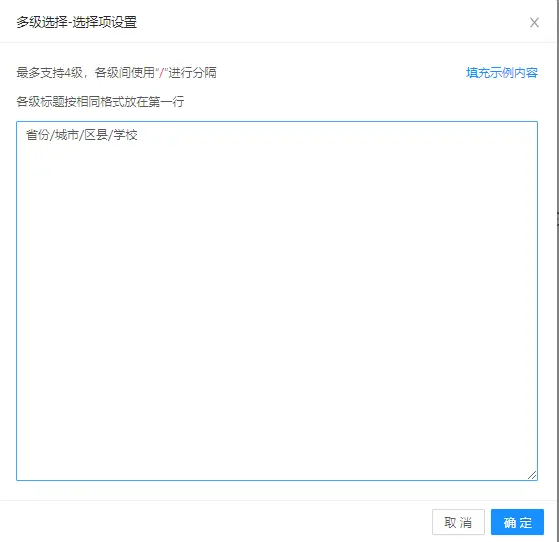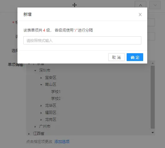 const str = '省份/城市/区县/学校\n广东省/深圳市/宝安区/学校1\n广东省/深圳市/宝安区/学校2\n广东省/深圳市/南山区/学校1\n广东省/深圳市/南山区/学校2\n广东省/深圳市/龙华区/学校1\n广东省/深圳市田区/学校1\n广东省/深圳市田区/学校2\n广东省/深圳市/龙岗区/学校1\n广东省/深圳市/龙岗区/学校2\n广东省/广州市/番禺区/学校1\n江西省/南昌市/青山湖区/学校1\n江西省/南昌市/西湖区/学校1\n江西省/赣州市/南康区/学校1'