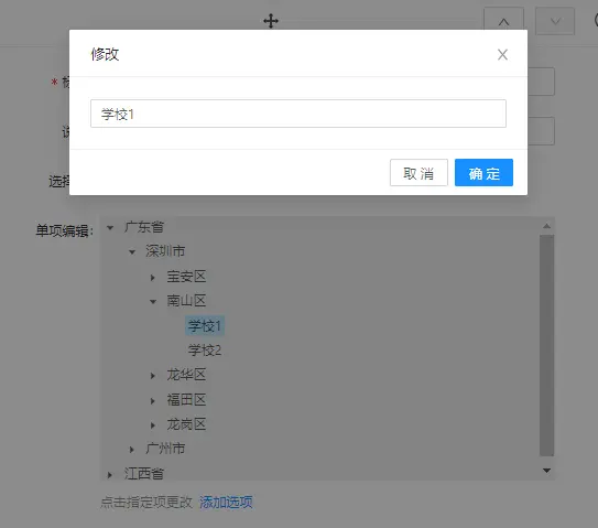 但是由于要做数据统计,如果编辑的话生成的 id 肯定会变,然后又开始了借鉴之路。看了下腾讯问卷的实现方式,哇,大厂就是不一样,各种情况都考虑到了,但是要我这个菜鸡实现的话还是有点难度的(看着这么复杂的交互有点懒不想动),所以新增我还是使用原来的方式,编辑的话我分别提供了单项编辑和新增,后面如果过需要删除的话也可以加上去。实现效果如下: