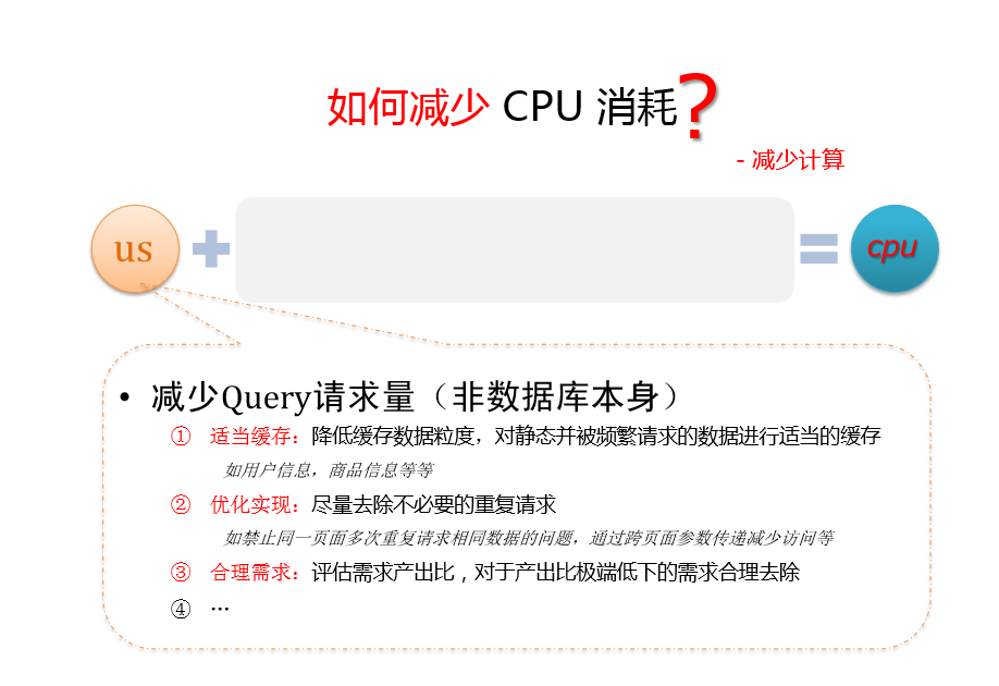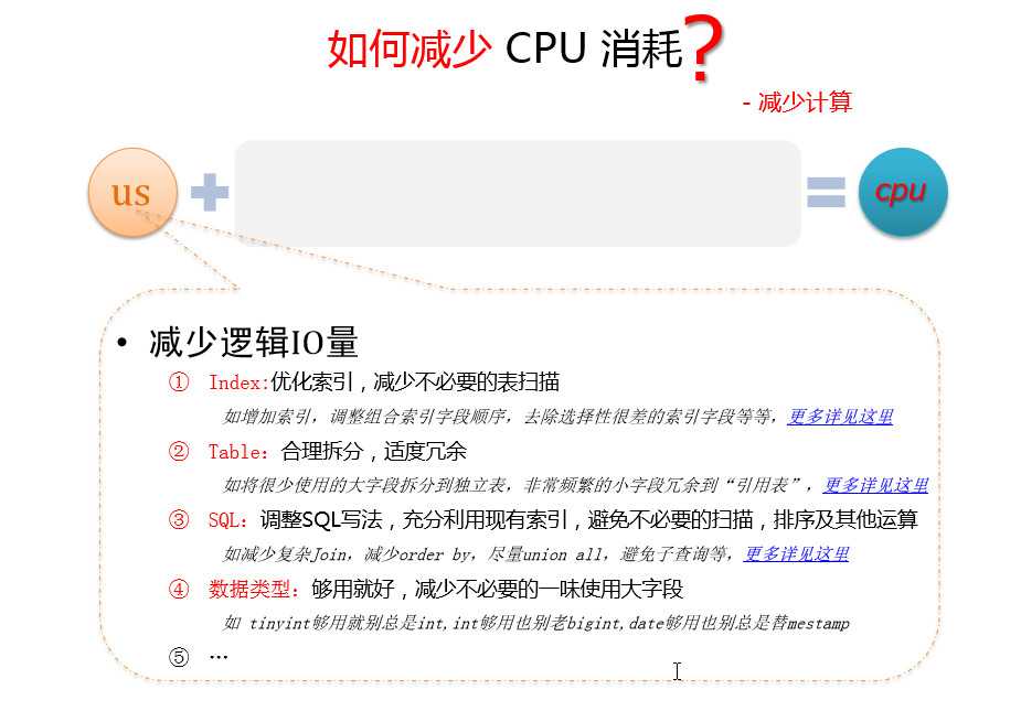 减少IO量 SQL/index,使用合适的索引减少扫描的行数(需平衡索引的正收益和维护开销,空间换时间) 提升IO处理能力 加cache/加磁盘/SSD