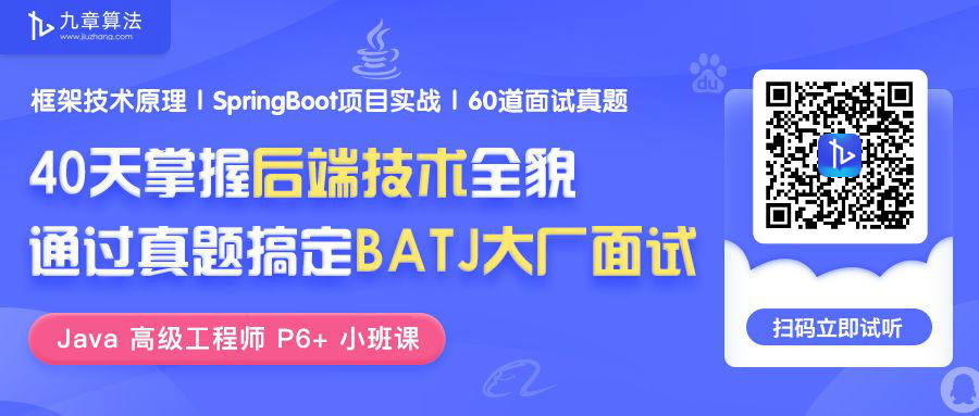 对标阿里P6+岗位,九章算法打造了**《Java 高级工程师 P6+ 小班课》**,从技术深度(精心准备)、技术广度(形成体系化)、技术软实力(简历与现场面试)出发,全方位帮助求职者达到大厂Java工程师的入职要求。