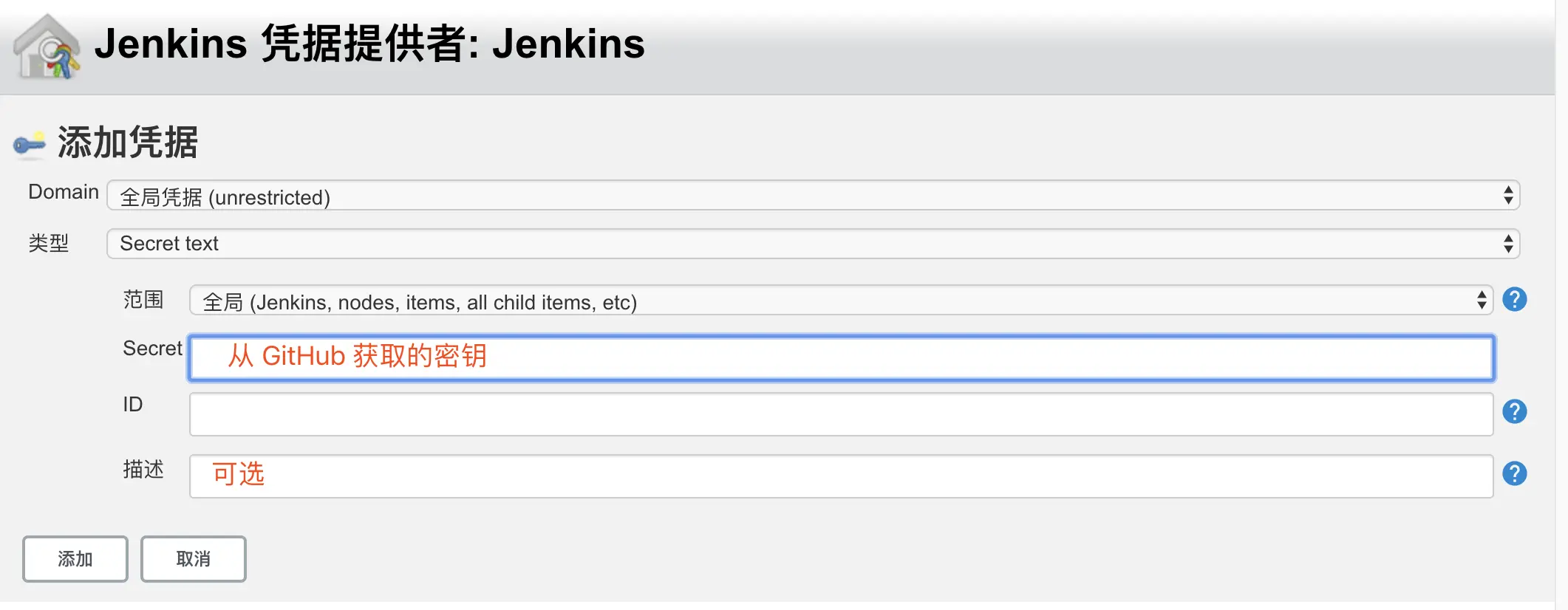 凭证类型选 Secret text: