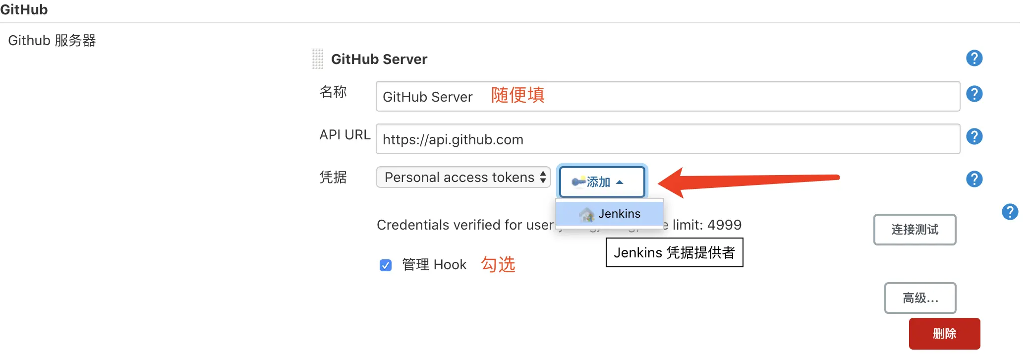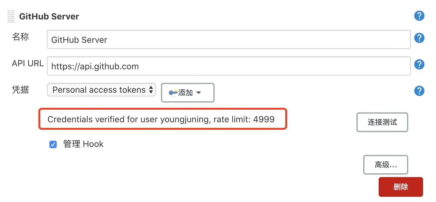 在凭据选上刚刚你添加的,勾上管理 Hook,点击“连接测试”,成功之后如下所示: