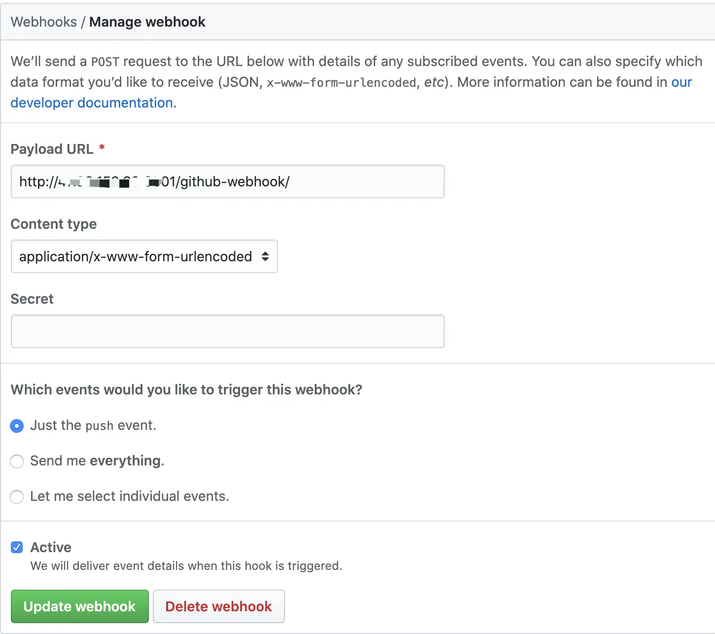 在 Payload URL 位置填入 webhook 地址,再点击底部的 Add webhook 按钮,这样就完成 webhook 配置了,今后当前工程有代码提交,GitHub 就会向此 webhook 地址发请求,通知 Jenkins 构建: