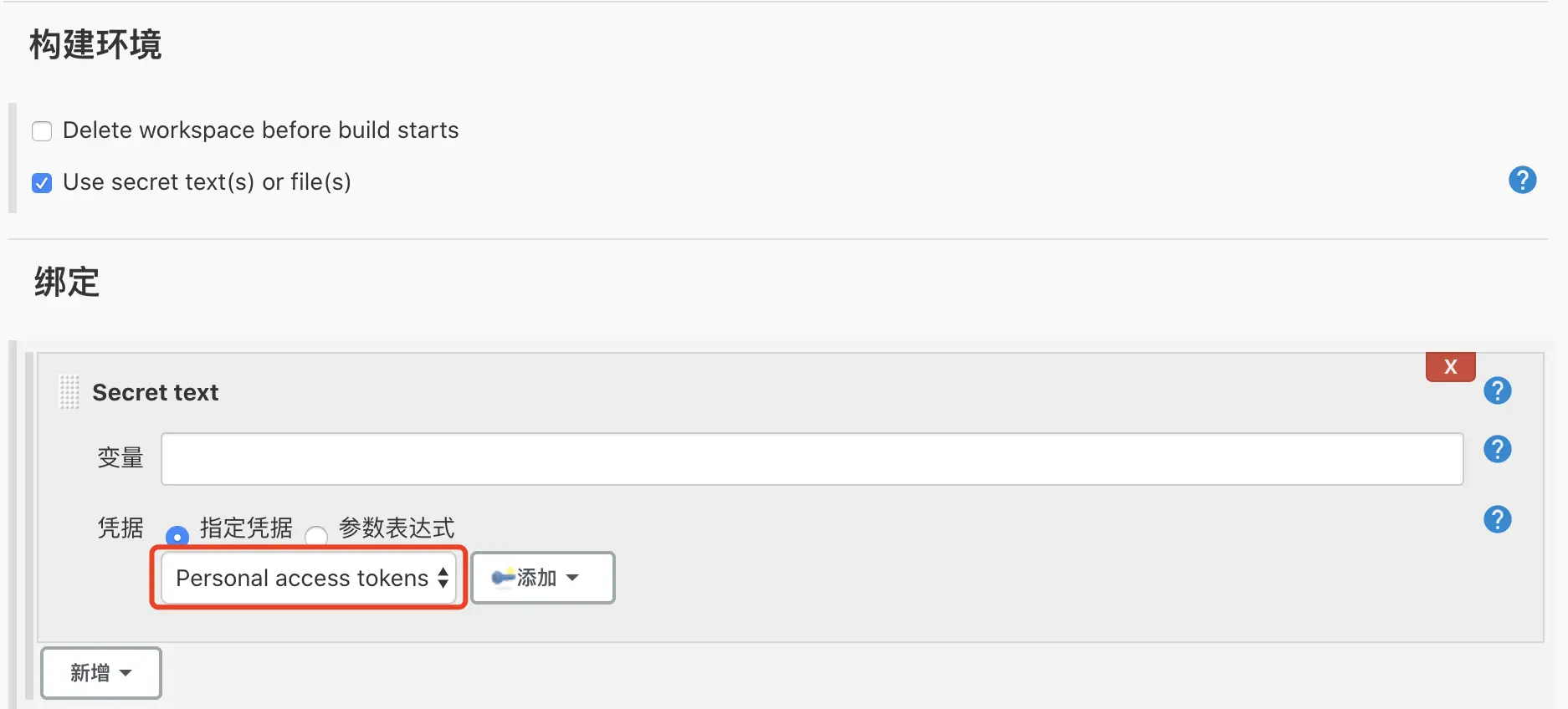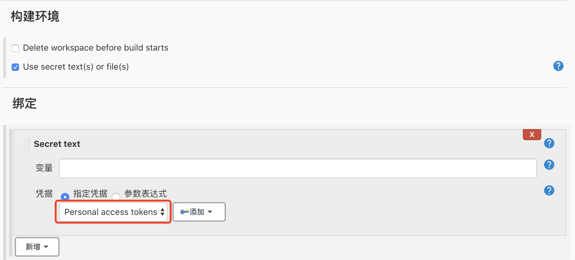 如下图所示,勾选 Use secret text(s) or file(s),下面的”凭据”选择我们之前配置过的凭证