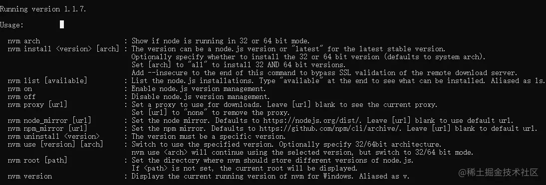安装成功以后,直接运行nvm,如果出现下面的情况,就说明安装成功了。